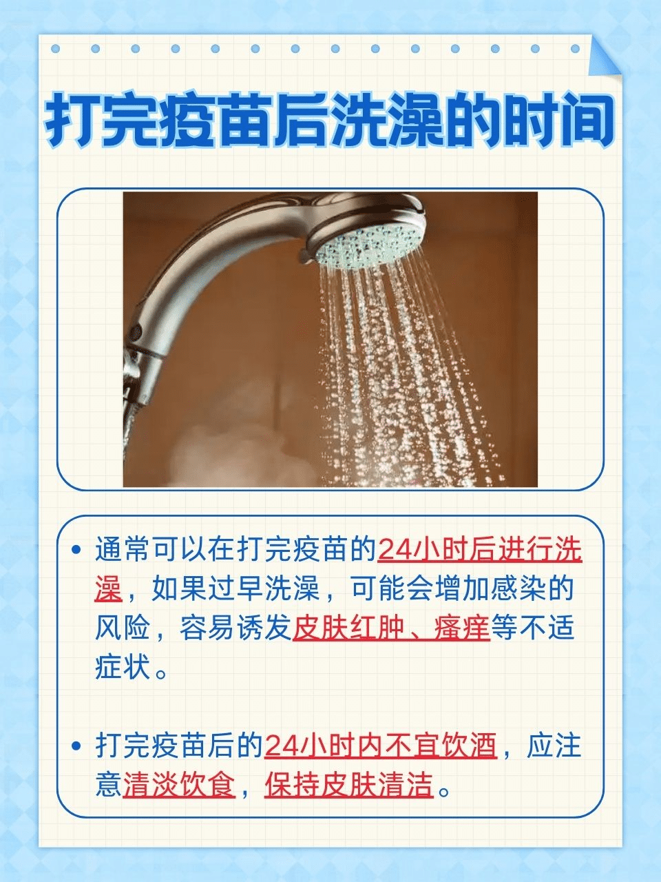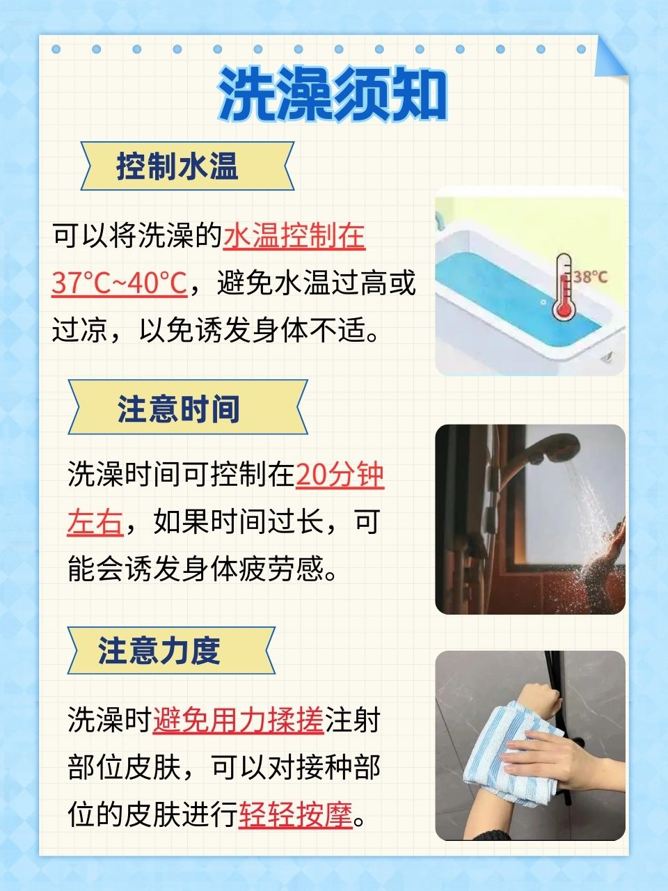 1、水温不宜过高:为了避免加重接种部位的不适感,建议使用温水洗澡,水温最好控制在37℃至40℃。过热的水温不仅可能刺激皮肤,还可能加速血液循环,影响疫苗效果。