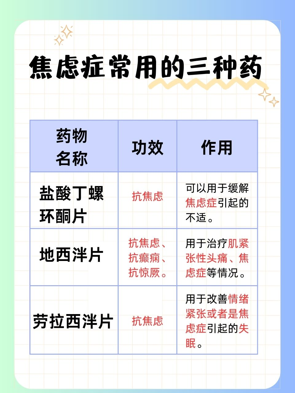 1、盐酸丁螺环酮片:是一种抗焦虑的药物,用于治疗多种焦虑症,有较明显的治疗效果。