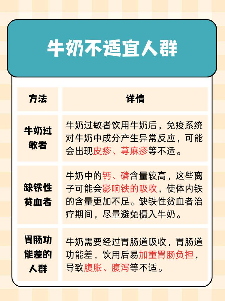 1、钙磷比例问题:牛奶中的钙磷比例较高,长期大量摄入可能导致体内钙磷比例失衡。虽然这种情况在女性中并不普遍,但对于一些特定人群来说,需要注意控制牛奶的摄入量。