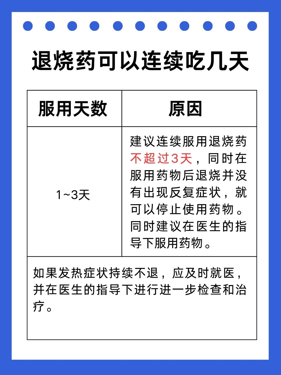 在拿到药物后,患者向我咨询,退烧药可以连续吃几天,根据他的情况,我向他解释到,一般情况下,如果发热症状在服用退烧药后逐渐缓解,且未出现反复,通常建议连续服用不超过3天。但如果发热症状持续不退,或者出现反复,应及时就医,并在医生的指导下进行进一步检查和治疗。同时,如果过量服用退烧药可能会导致药物对肝肾功能产生损伤。在使用药物时建议遵医嘱。