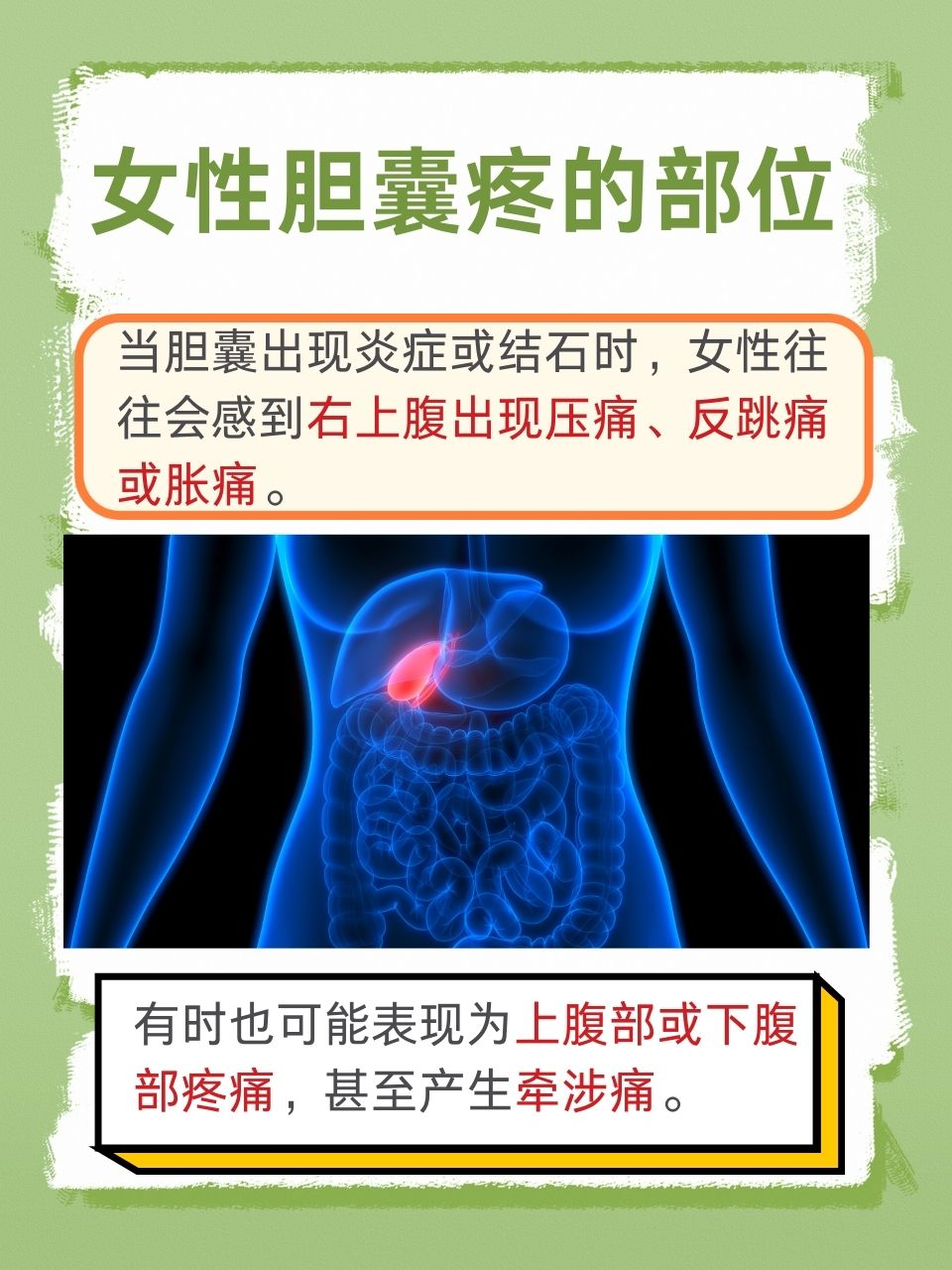 首先,我们要明确胆囊在体内的位置。胆囊位于肝脏的背面,右侧胸部的下方。因此,当胆囊出现问题时,疼痛主要集中在右上腹部。这种疼痛,临床上被称为胆绞痛,发生时可能如刀割般剧烈,令人难以忍受。而且,胆囊疼痛还可能放射至背部和肩部,尤其是右侧,这是因为胆囊与这些区域的神经有共同的传入途径。