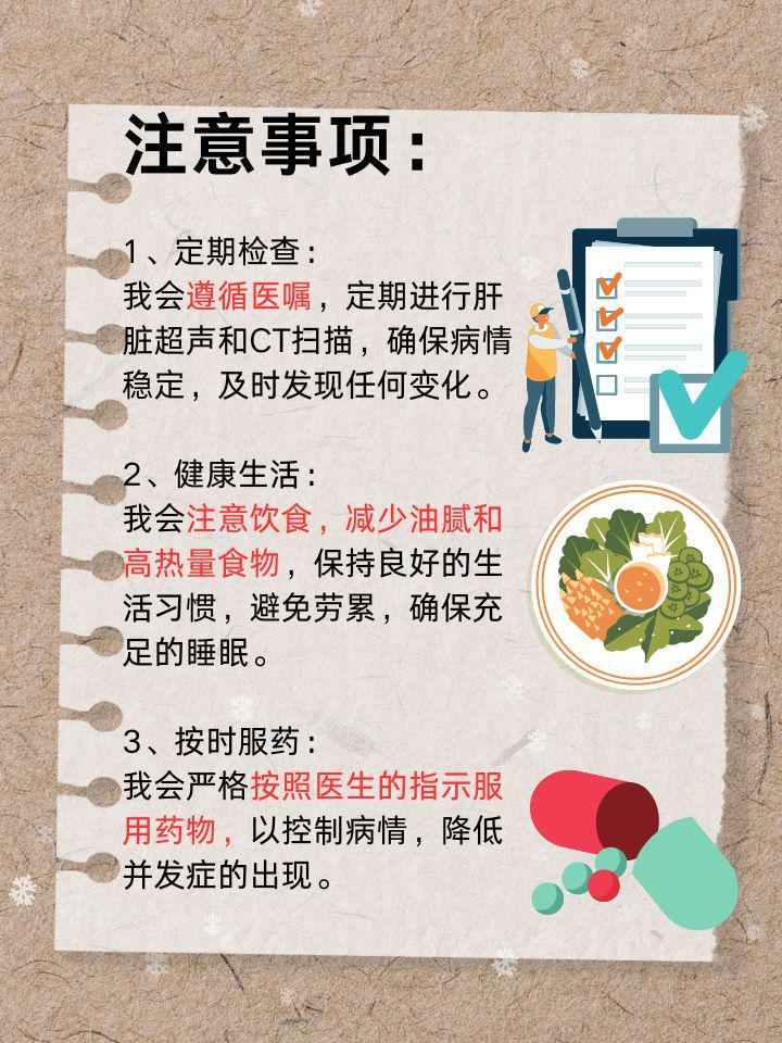 在了解了我的病情和治疗建议后,我决定积极配合医生的治疗方案,定期进行复查,并且调整自己的生活方式,以期能够更好地控制病情。医生告诉我平时要注意:
