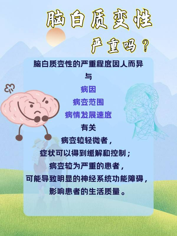 脑白质变性的严重性主要取决于病变的范围和患者是否出现相应的临床症状。轻度脑白质变性可能仅表现为记忆力下降、注意力不集中等轻微症状,通常不被视为严重疾病。然而,如果脑白质变性的范围较大或患者出现痴呆、瘫痪等严重症状,则可能较为严重,并影响患者的日常生活。