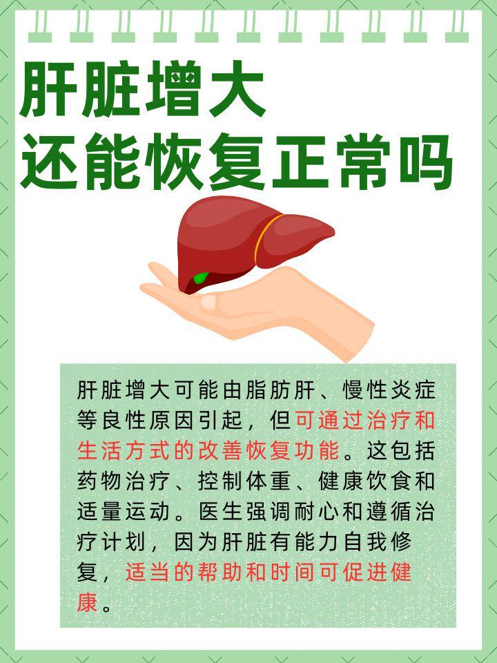 听到这个消息,我松了一口气,但仍然想知道肝大了还能恢复正常吗。医生详细地解答了我的疑问,并给我制定了适合的治疗方案。医生建议我要有耐心,并积极配合治疗方案,因为肝脏是一个具有很强再生能力的器官,只要给予适当的支持和时间,它就有可能恢复到正常大小和功能。
