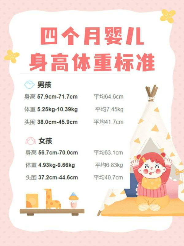 在儿童的生长发育过程中,家长应关注儿童的身高、体重等生长指标,比如四个月的月龄婴儿标准如下: