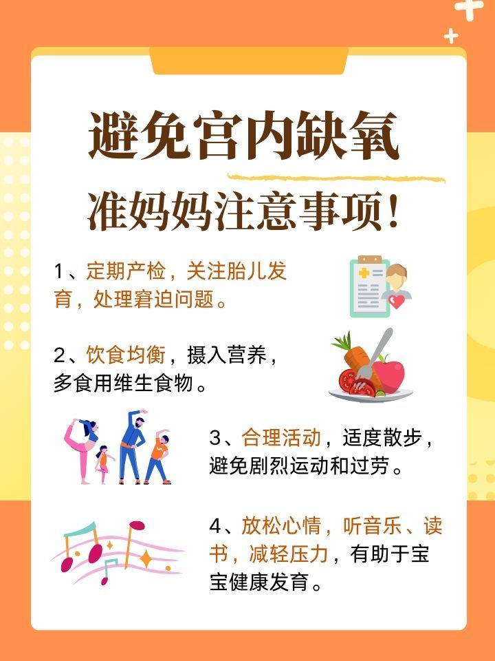 对于小丽,我们立即采取了紧急措施,进行胎儿心跳监测和胎儿宫内输血等处理。同时,通过给予氧气、特殊的营养支持,以及提供别的协助胎儿供氧的方式,达到缓解宫内缺氧的目的。在妈妈小丽的积极配合下,最终宝宝成功度过了宫内缺氧的危机。在生活中为了避免宫内缺氧的发生,准妈妈们需要注意以下几点: