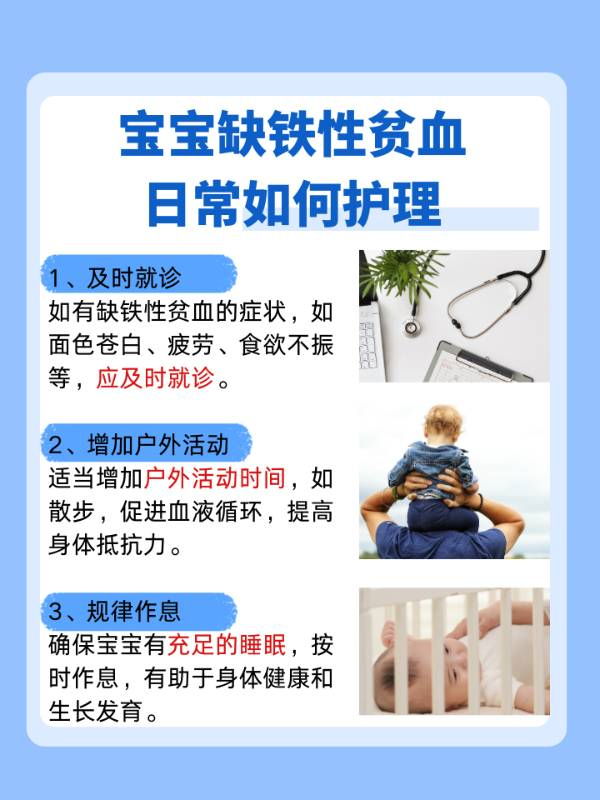 口服铁剂治疗:给予小宝宝口服复方硫酸亚铁颗粒,每日一次,以补充铁元素。