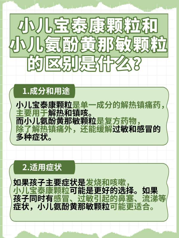 我轻松地告诉家长,小儿宝泰康颗粒主要用于缓解由感冒引起的咳嗽、发热、咽痛等症状,而小儿氨酚黄那敏颗粒则因含有抗过敏成分,适用于治疗因感冒引起的发热、头痛及过敏症状。