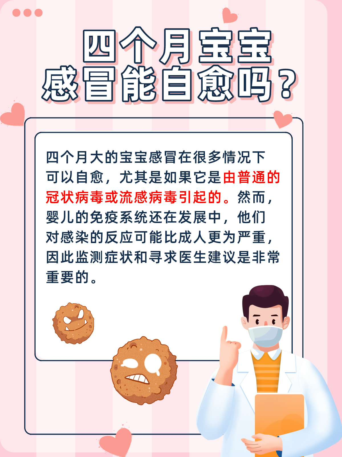 一个下午,李女士带着她四个月大的宝宝小陈来到我的诊室。小陈最近出现了感冒的症状,比如鼻塞、轻微咳嗽和偶尔的喷嚏,这让初为人母的李女士非常焦虑。她在网络上看到很多关于宝宝感冒的信息,有的说宝宝的感冒可以自愈,有的则建议立即就医。为了让她的心安定下来,她希望我能给出专业的意见。