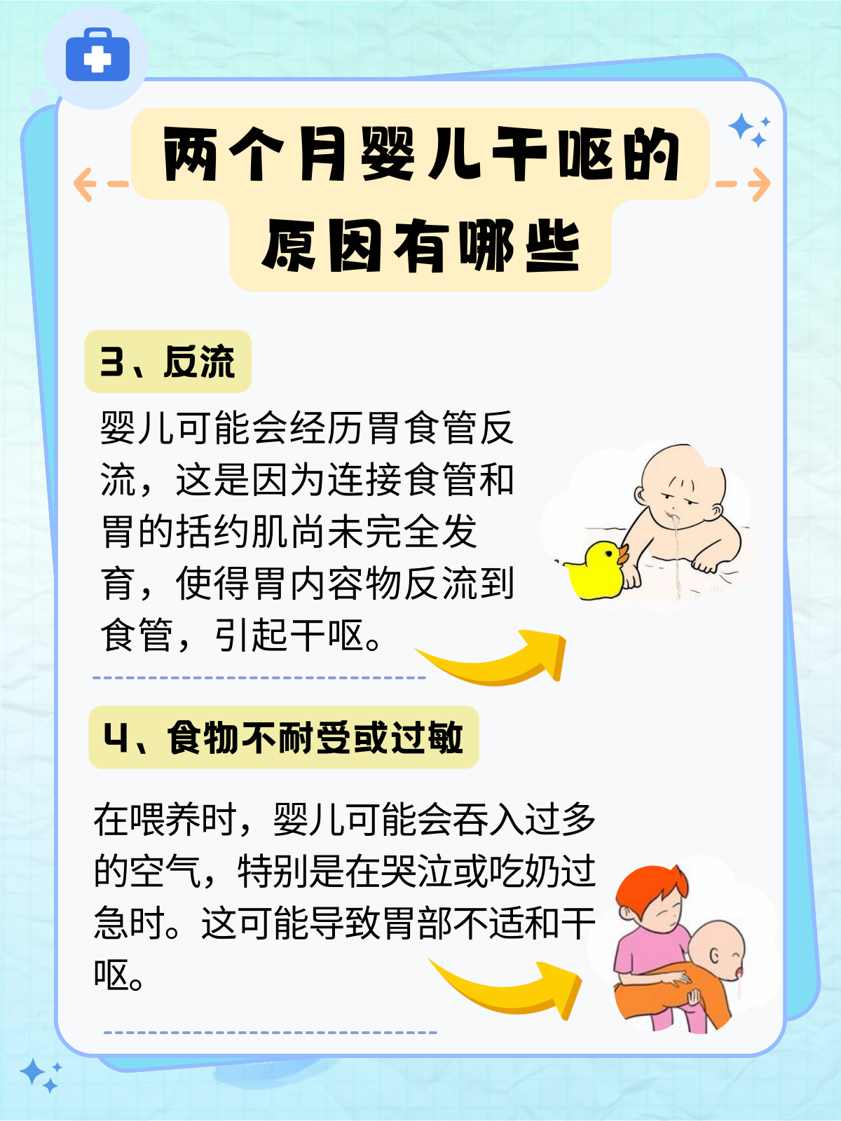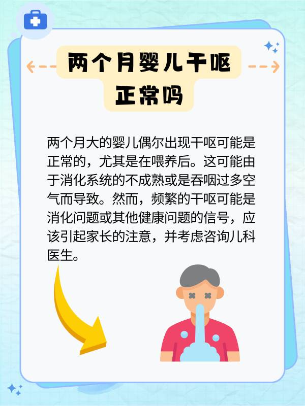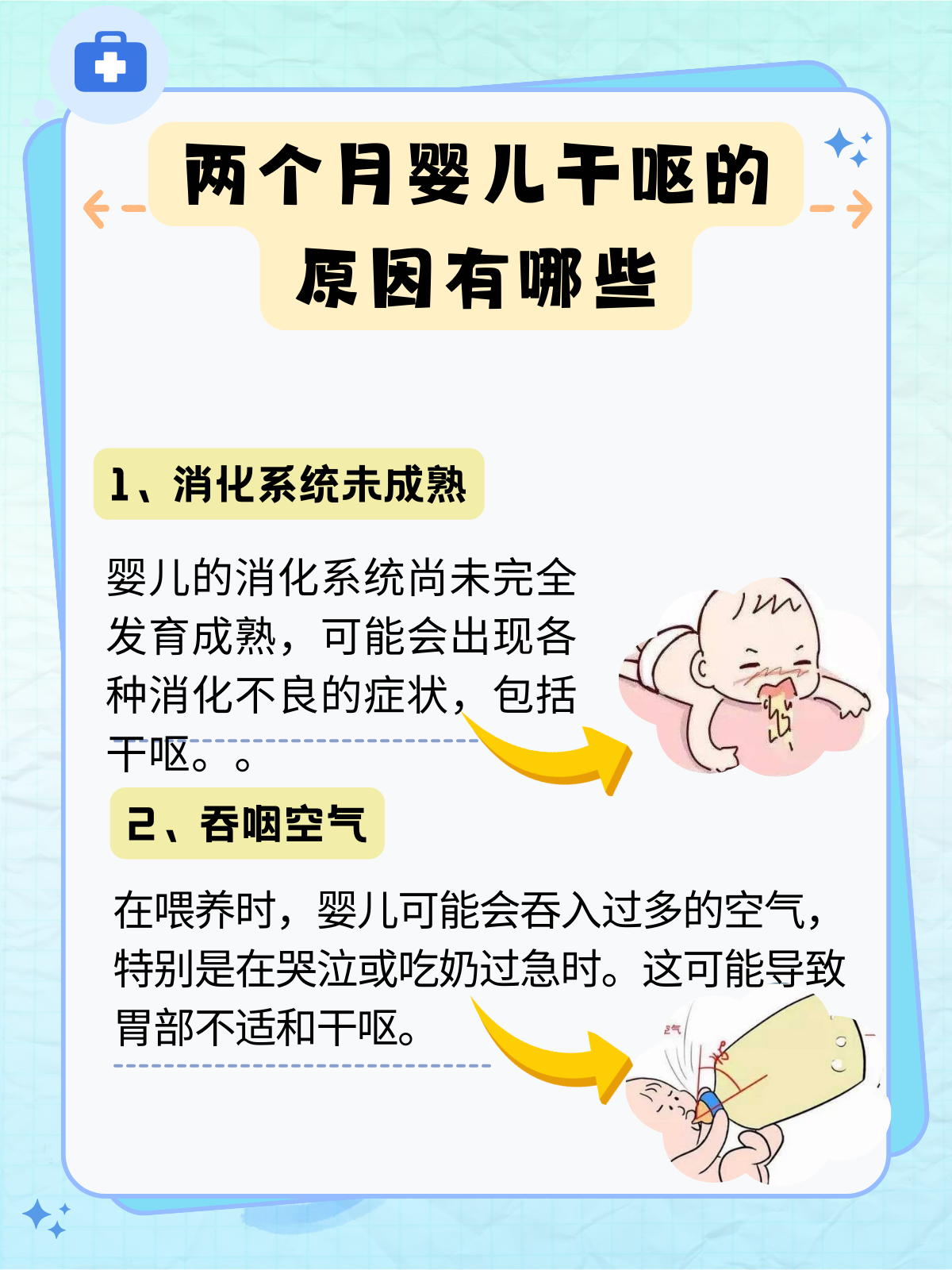 我解释给小悦的妈妈听,对于两个月大的婴儿来说,偶尔的干呕并不罕见。这可能是因为他们的消化系统还不够成熟,有时候在喂养过程中吞咽了过多的空气,或是因为轻微的胃食管反流引起的。大多数情况下,这些症状随着孩子的成长会逐渐减少和消失。
