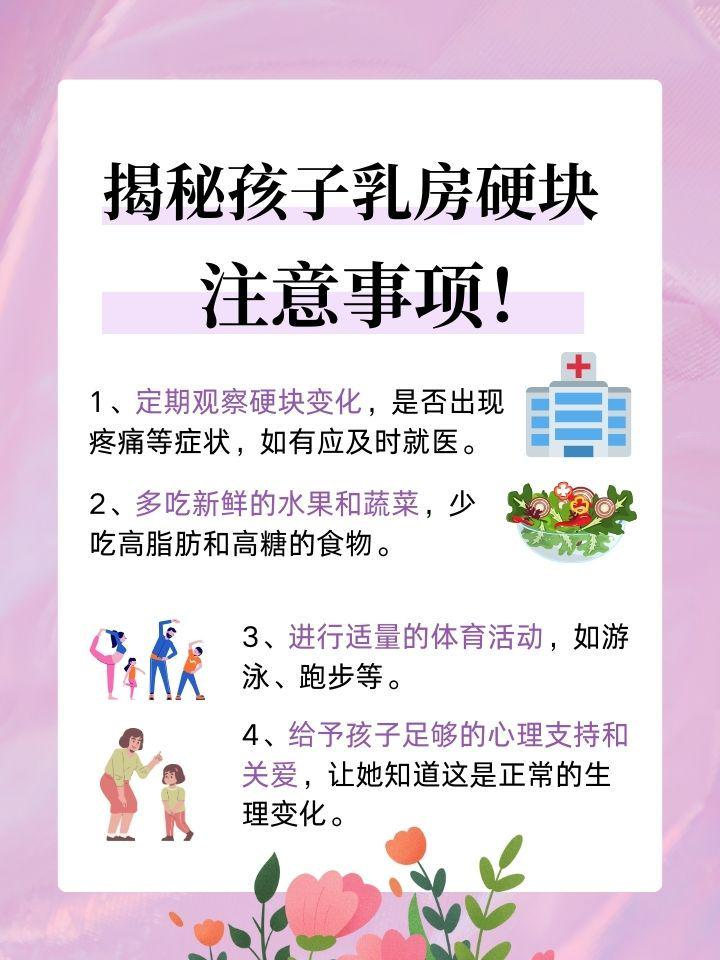 1、 观察变化:定期观察硬块是否有变大或者变硬,或者是否出现疼痛等症状。如果有任何变化,应及时就医。这一点非常重要,因为虽然目前的检查结果显示是良性的,但身体的任何变化都值得关注,以确保孩子的健康。