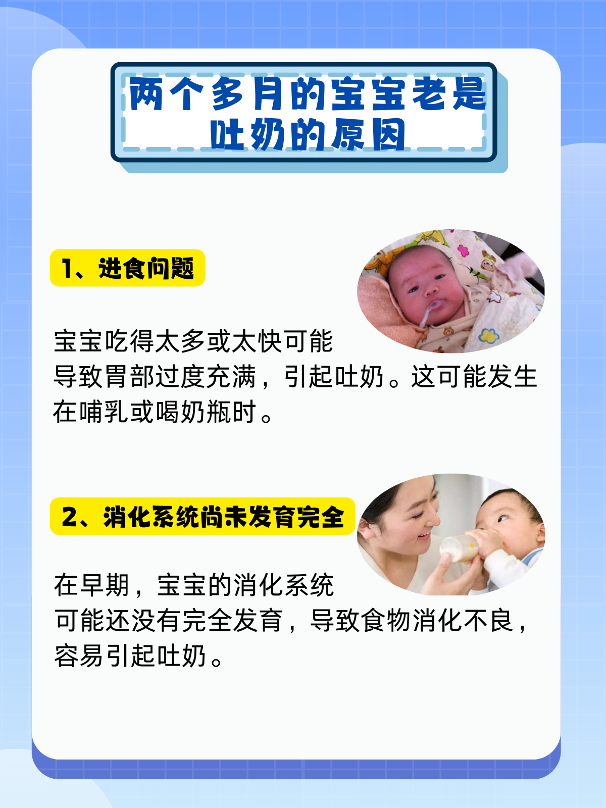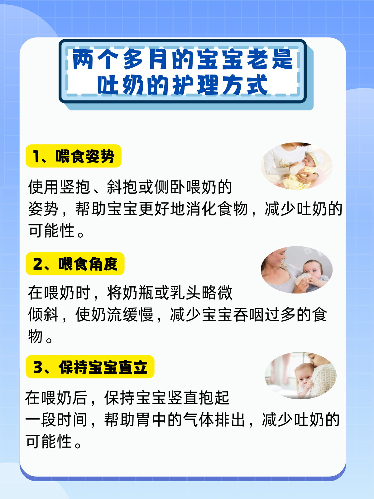 我外甥是一个两个多月大的可爱宝宝,因为老是吐奶,每当喂完奶后,都让他妈妈感到十分焦虑。