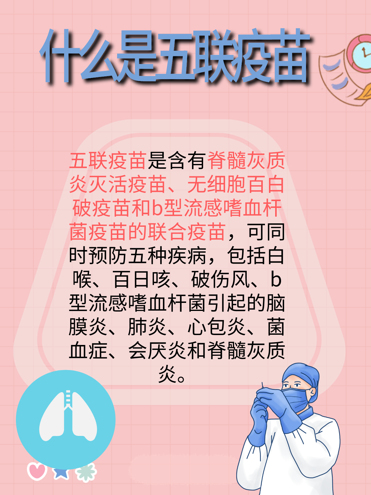 关于五联疫苗预防哪些疾病的问题,小李解释说,五联疫苗是一种集合了五种疾病疫苗的联合疫苗,用于预防白喉、破伤风、百日咳、脊髓灰质炎和B型流感嗜血杆菌引起的疾病。