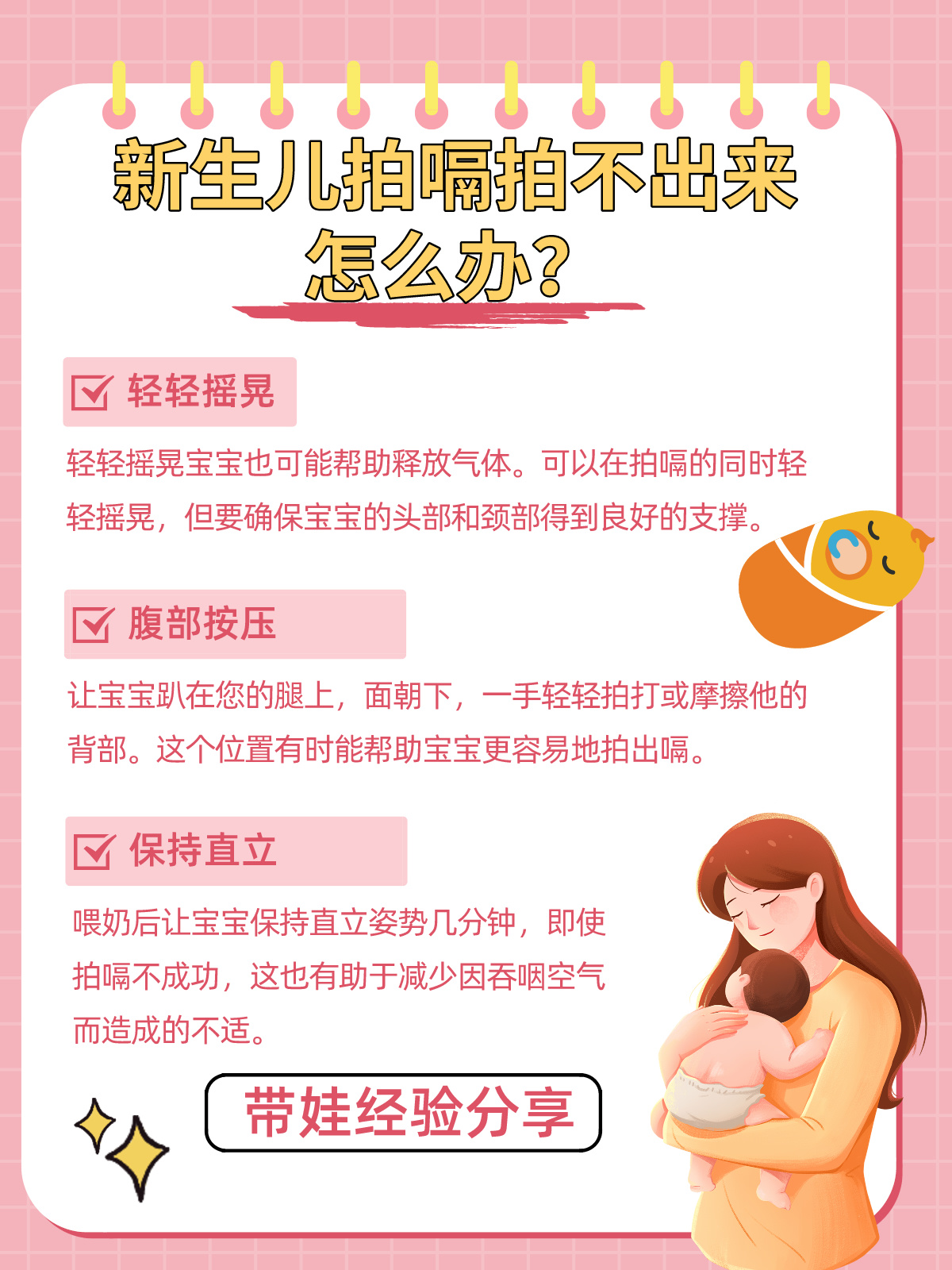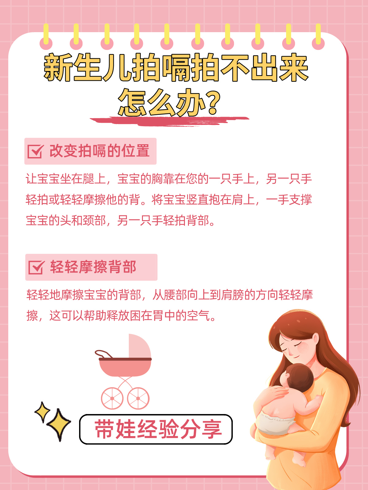 有一天,我咨询了一位儿科医生,他向我讲解了一些不那么传统但非常有效的拍嗝方法,如改变拍嗝的位置、 轻轻摩擦背部、轻轻摇晃等,我决定,为了我的小公主,我要尝试这些新方法。