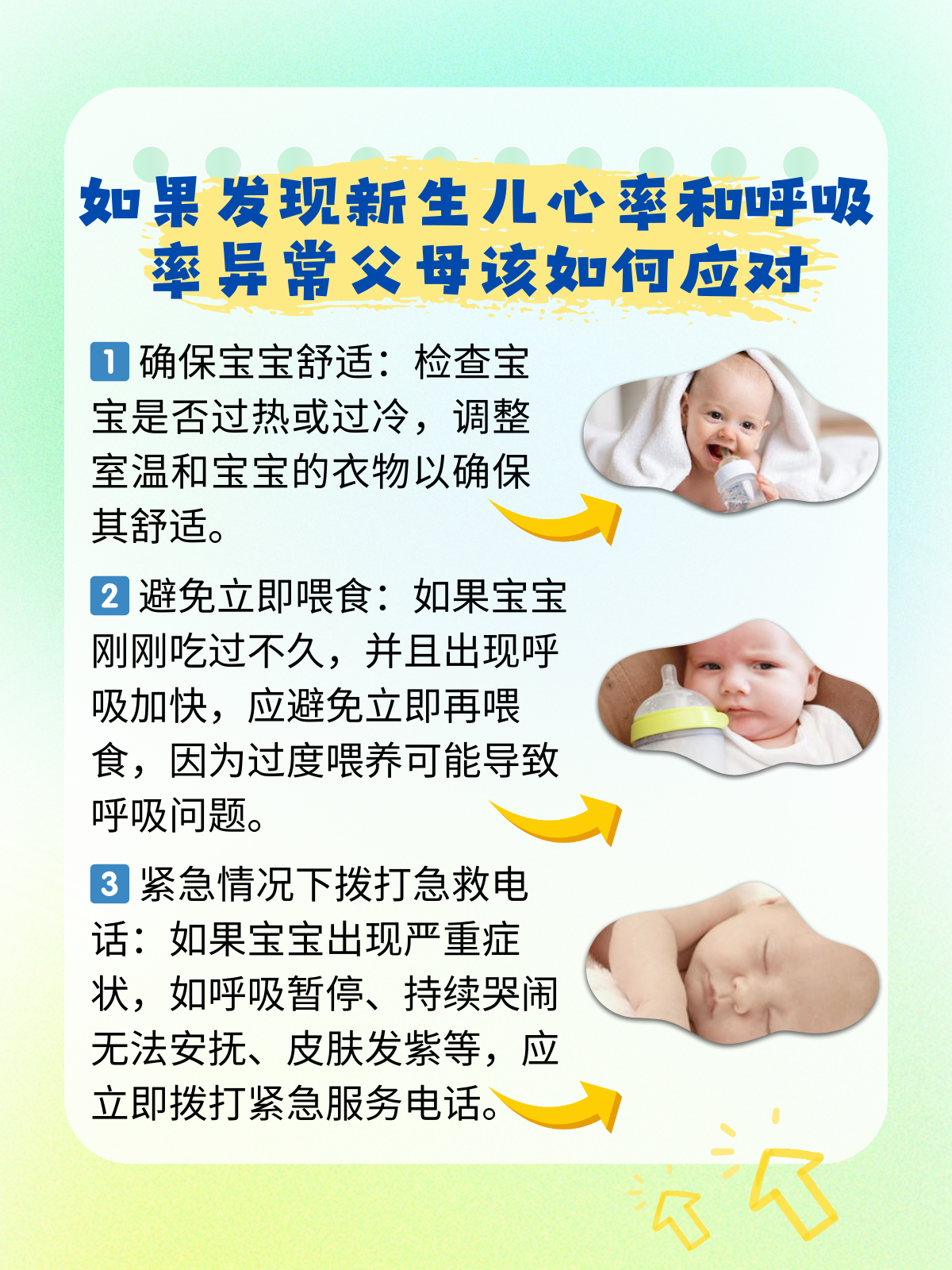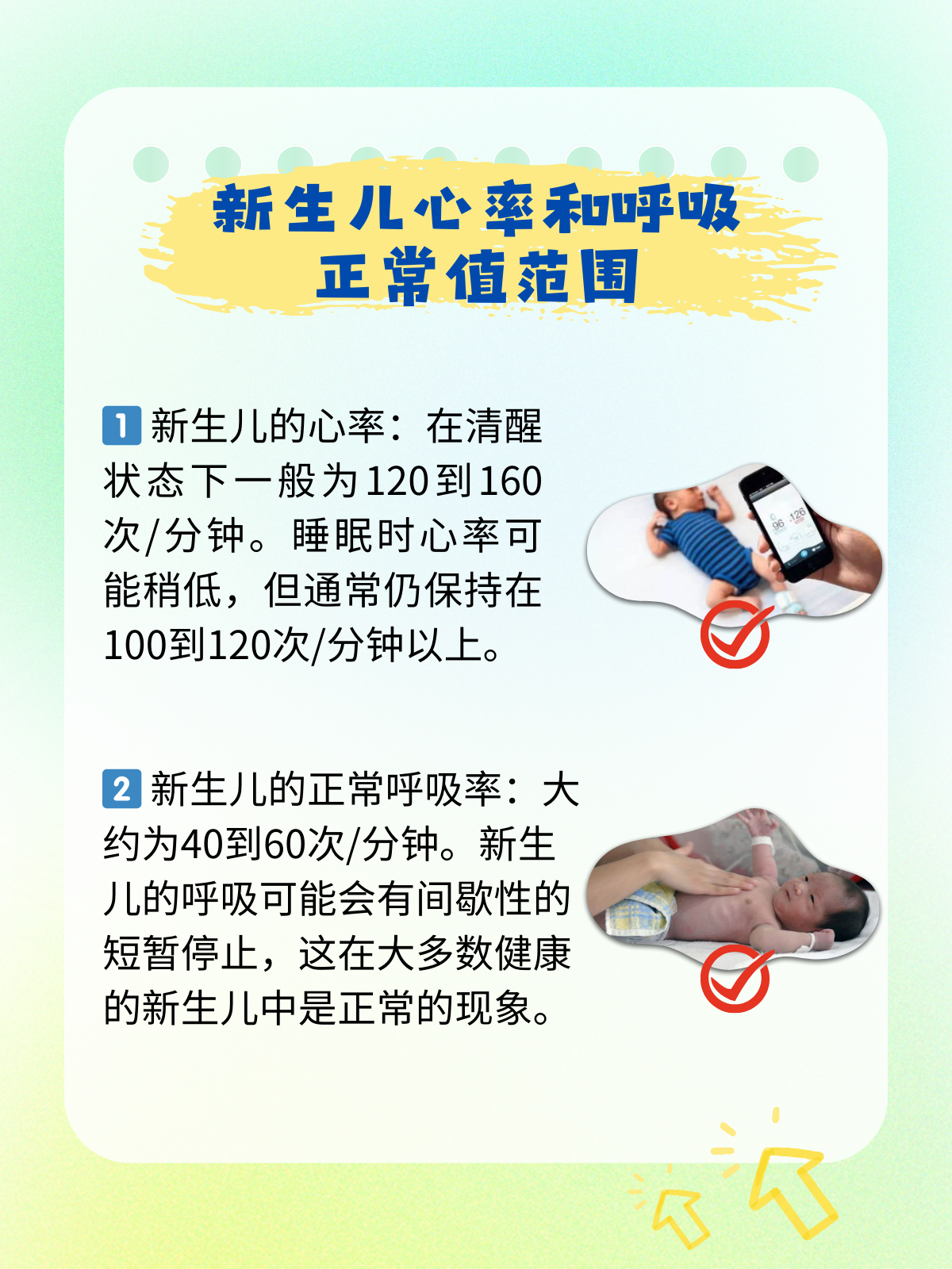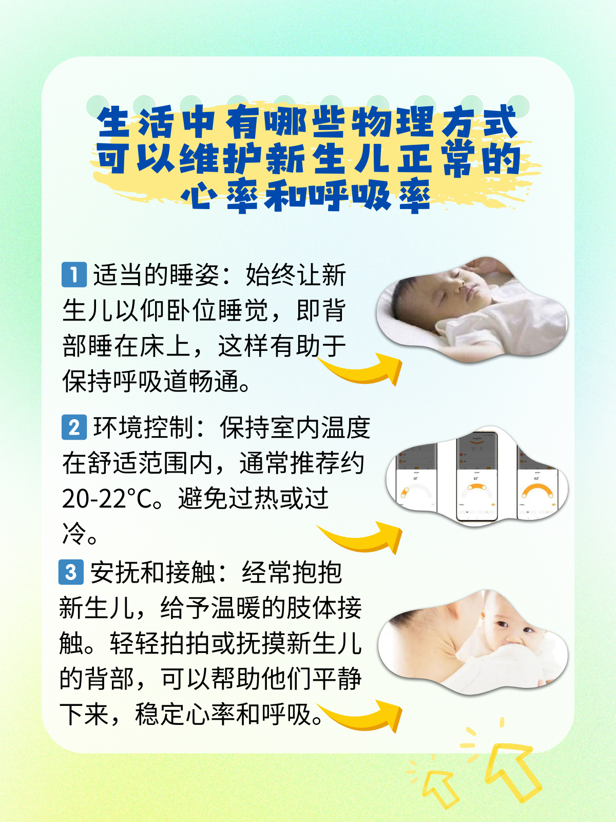 今天我要为大家讲解关于新生儿心率和呼吸的知识,并分享一位可爱宝宝的真实故事。故事的主人公是一位名叫小明的新生儿。他是一个健康、活泼的宝宝,但他的父母总是担心他的心率和呼吸是否正常。作为医生,我告诉他们什么是新生儿的正常心率和呼吸。新生儿的心率一般在每分钟120-160次之间,呼吸频率则约为每分钟40-60次。这些数值在新生儿期会略微波动,但在正常范围内。 了解了正常的数值范围,接下来我向他们介绍了如何照顾新生儿心率和呼吸: 1.保持室内空气新鲜。新生儿对空气质量比较敏感,所以要保持室内空气流通,避免二手烟和异味的刺激。 2.适宜的温度和湿度。新生儿对环境温度和湿度的适应能力较弱,保持室温在25-26℃左右,湿度在50-60%之间是比较合适的。 3.正确的喂养姿势。在喂养宝宝时,要保持他们的头部、颈部和背部处于相对稳定的位置,以便呼吸通畅。 4.室内光线的控制。对于新生儿而言,室内的光线过强会刺激他们的神经和眼睛,所以要保持柔和的光线,避免强光直射。 除了以上方法,我还向父母们强调了定期的体检和观察的重要性。定期带孩子去医院进行体检,及时观察和记录宝宝的心率和呼吸情况,可以及早发现问题并采取措施。他的父母听从了我的建议,并且细心照顾他的心率和呼吸。每天通过观察和记录,他们发现小明的心率和呼吸都保持在正常范围内,让他们松了一口气。每个宝宝都是家庭的希望和未来,我们需要更加细心地照顾他们的心率和呼吸。通过以上方法,希望每个宝宝都能健康成长,快乐幸福地度过每一天。如果你有什么相关问题或疑问欢迎在评论区给我留言。