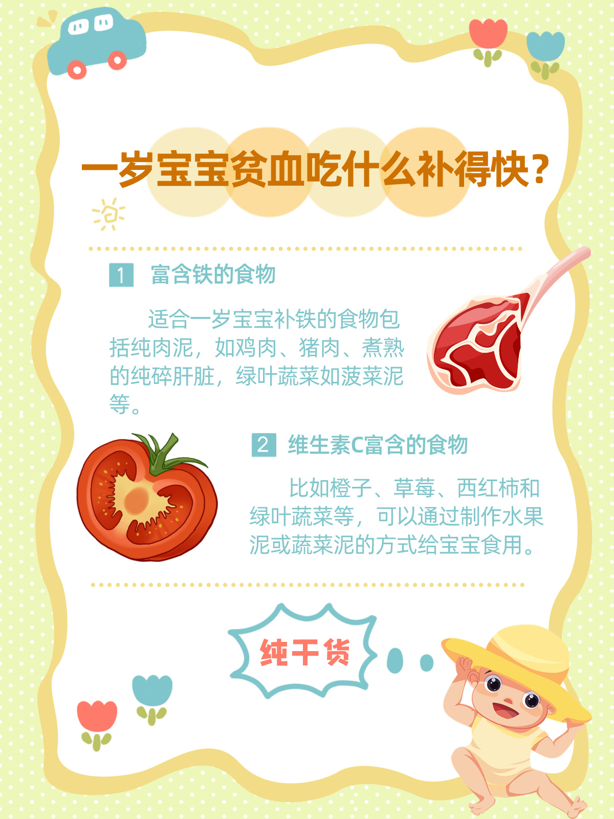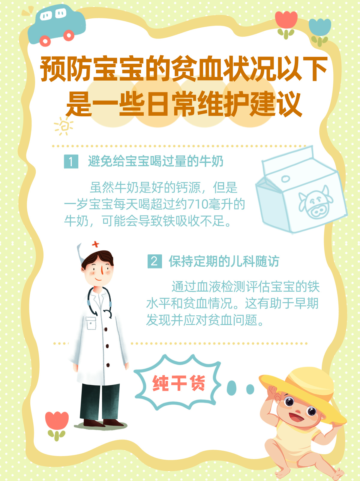 医生解释说,对于像小梅这样正在快速成长的宝宝来说,铁元素特别重要,因为它帮助制造血红蛋白,运送氧气到身体的各个部位。医生建议了一些补铁的食物,还开了铁补充剂。