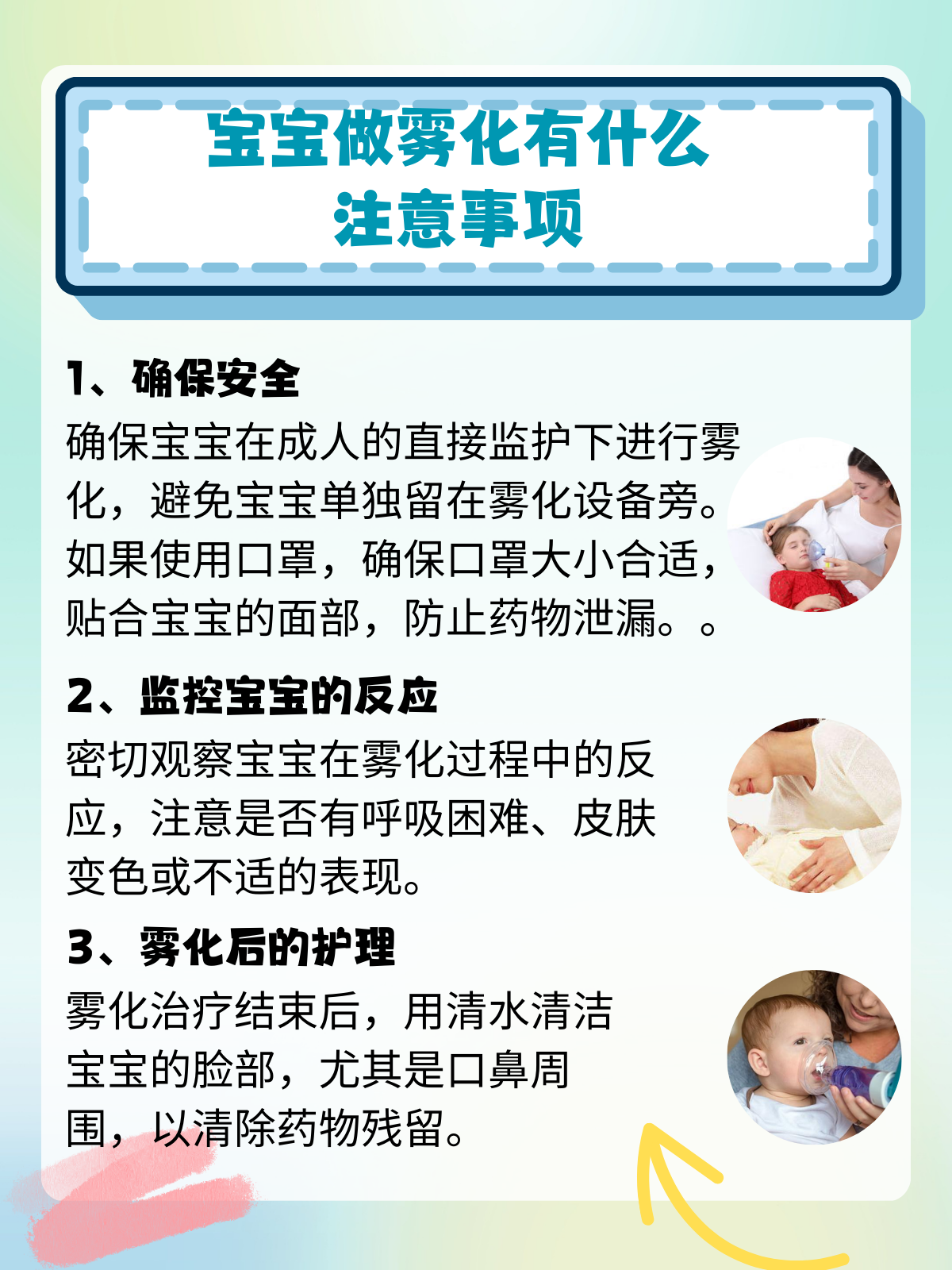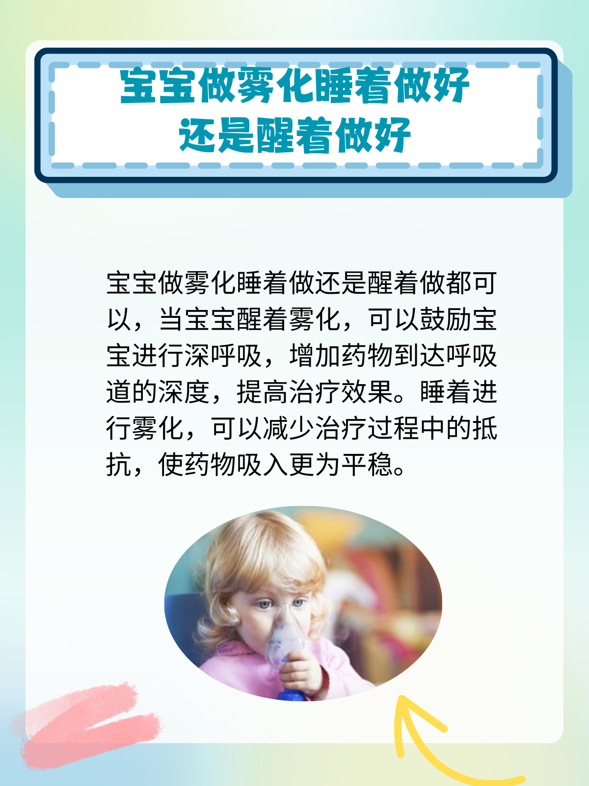 医生耐心地解释说,这主要取决于宝宝的反应和具体情况。一般来说,如果宝宝能够安静地接受雾化治疗,不管是醒着还是睡着都可以。医生建议我们先在宝宝醒着的时候尝试,如果宝宝能接受,就继续;如果宝宝感到不适,我们可以选择在他熟睡时进行治疗。