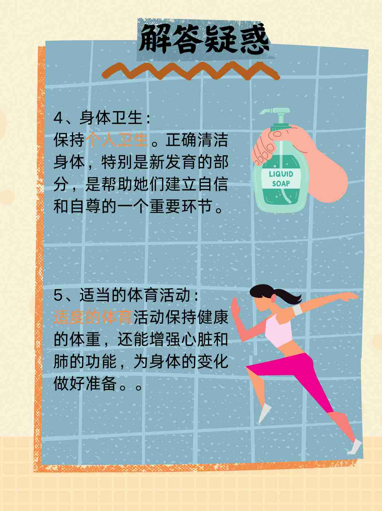 4、身体卫生:随着身体发生变化,保持良好的个人卫生也非常重要。教育孩子如何正确清洁身体,特别是新发育的部分,是帮助她们建立自信和自尊的一个重要环节。