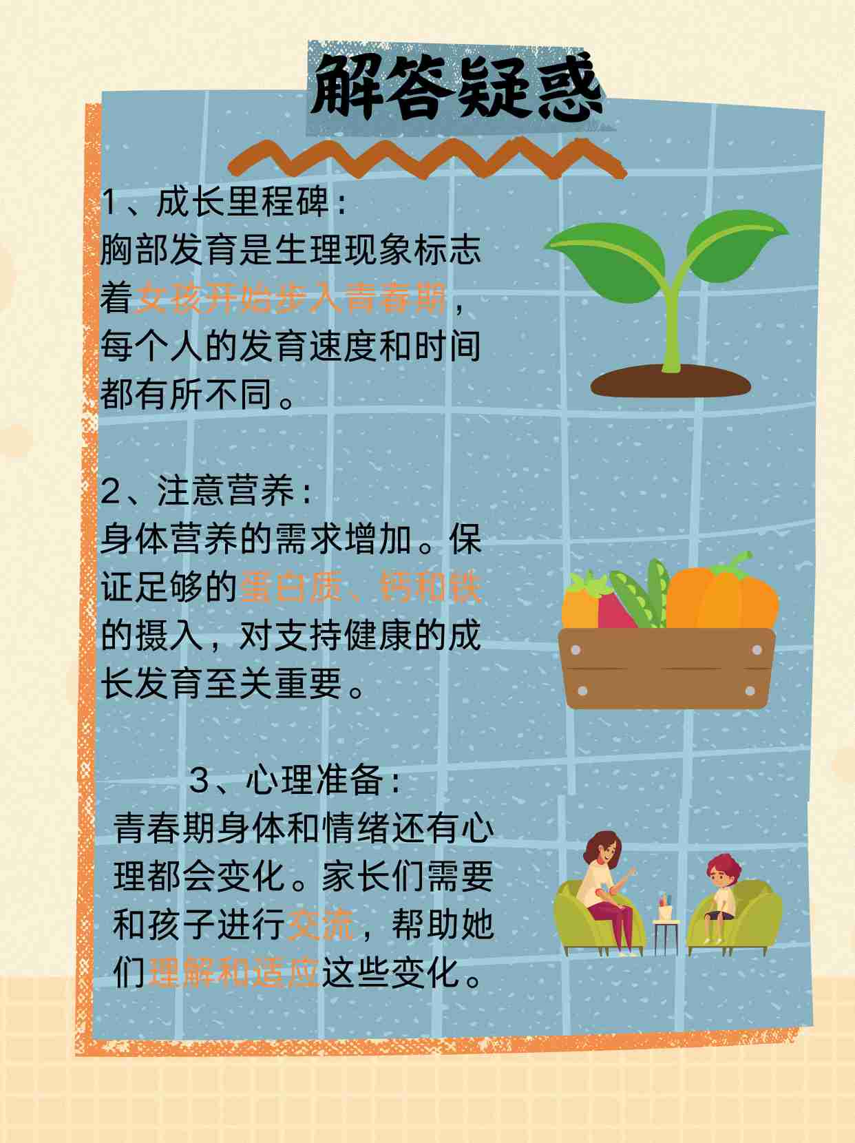 1、成长里程碑:胸部发育是青春期初期的正常生理现象之一,标志着女孩开始步入青春期。通常,这个阶段会从九到十四岁不等,每个人的发育速度和时间都有所不同。