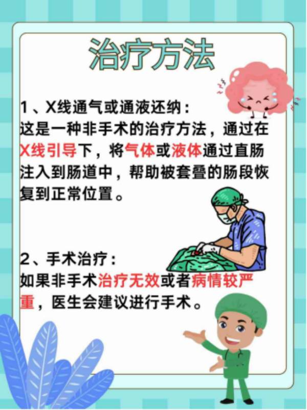 1、X线通气或通液还纳:这是一种非手术的治疗方法,通过在X线引导下,将气体或液体通过直肠注入到肠道中,帮助被套叠的肠段恢复到正常位置。大多数小朋友通过这种方法可以成功治疗,而且恢复得很快。