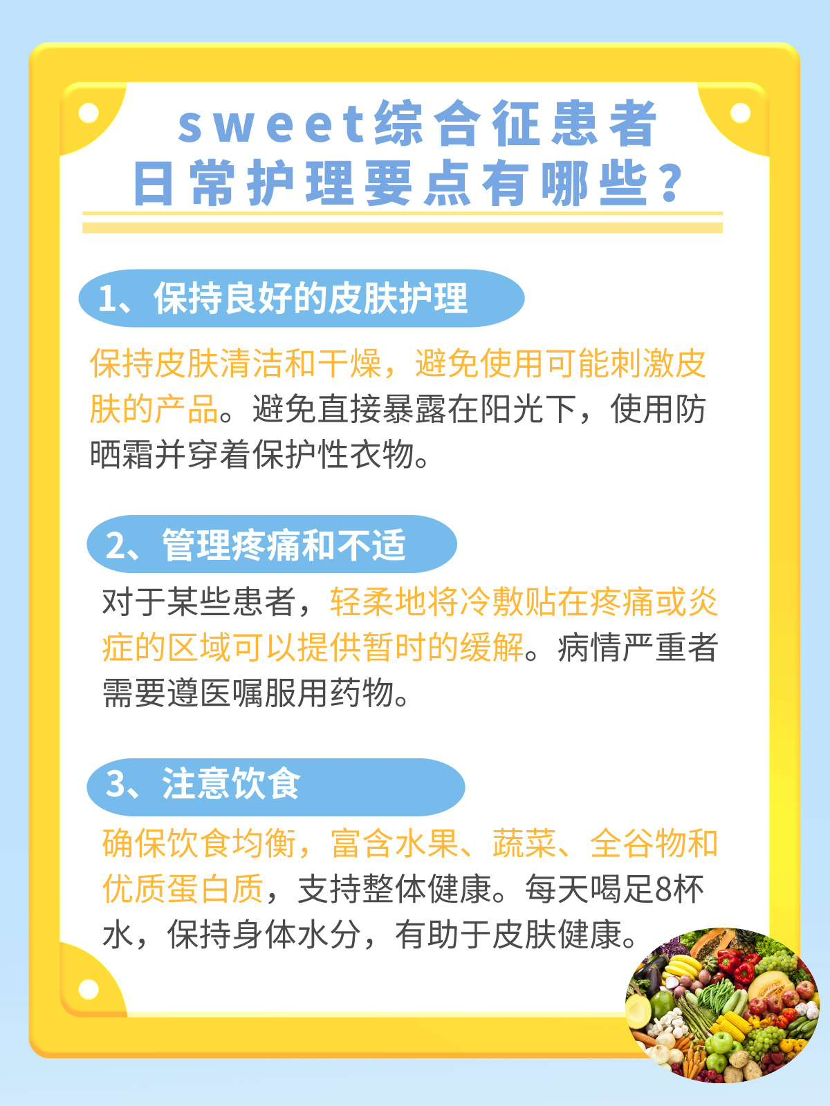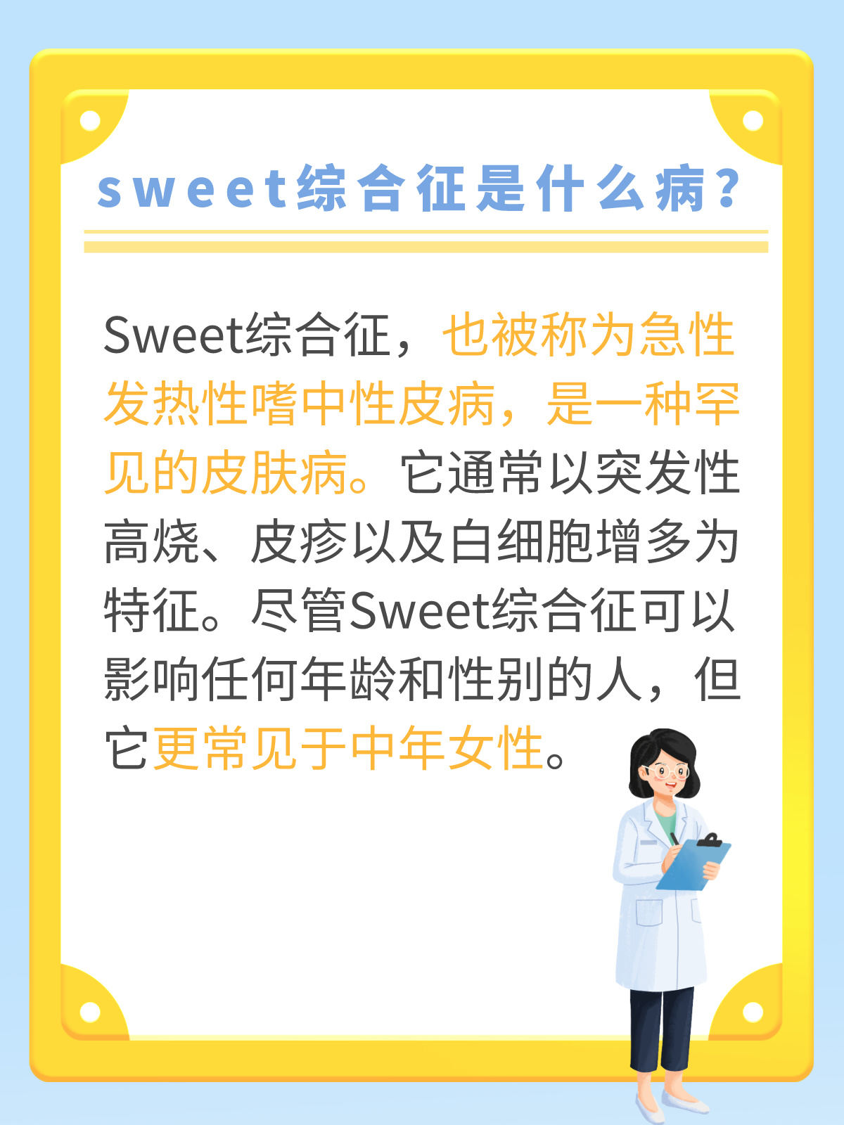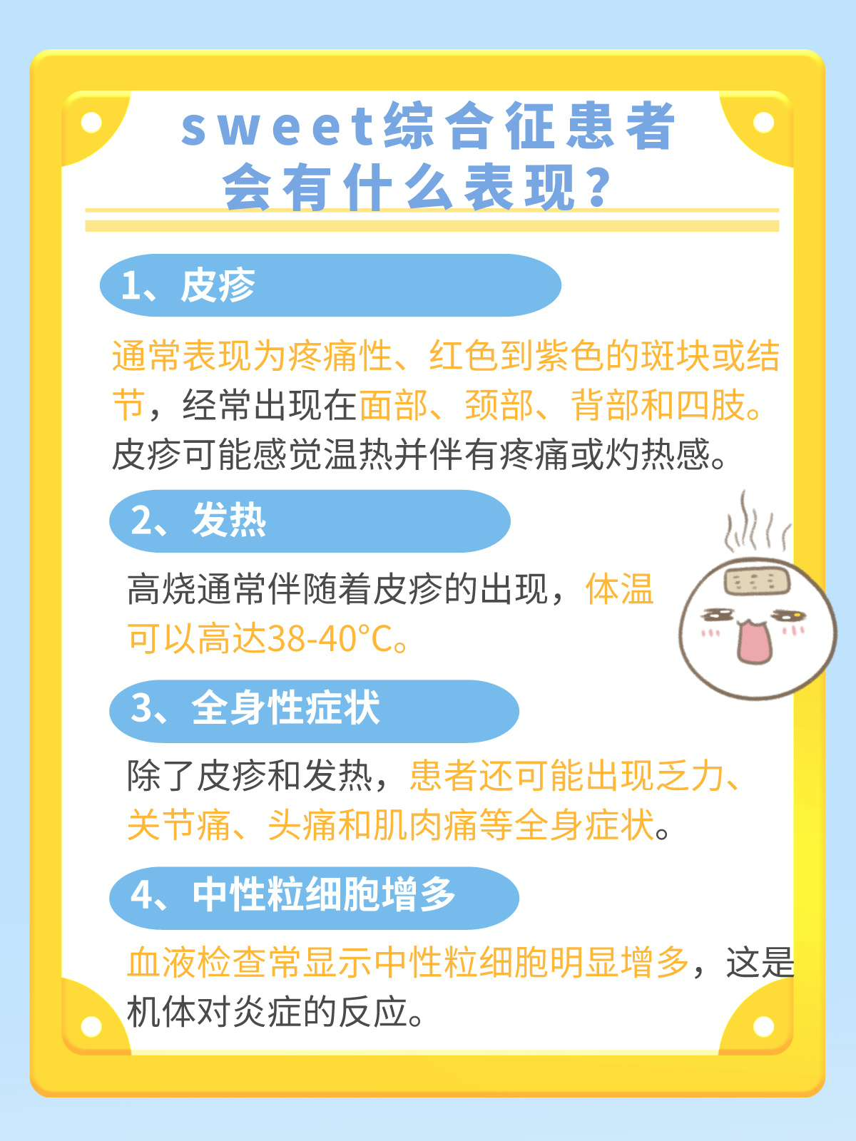 Sweet综合征,又称为急性发热性嗜中性皮病,是一种相对罕见的皮肤病,通常伴有发热和全身不适。在进行了一系列的血液检查和皮肤活检后,我的初步诊断得到了确认。