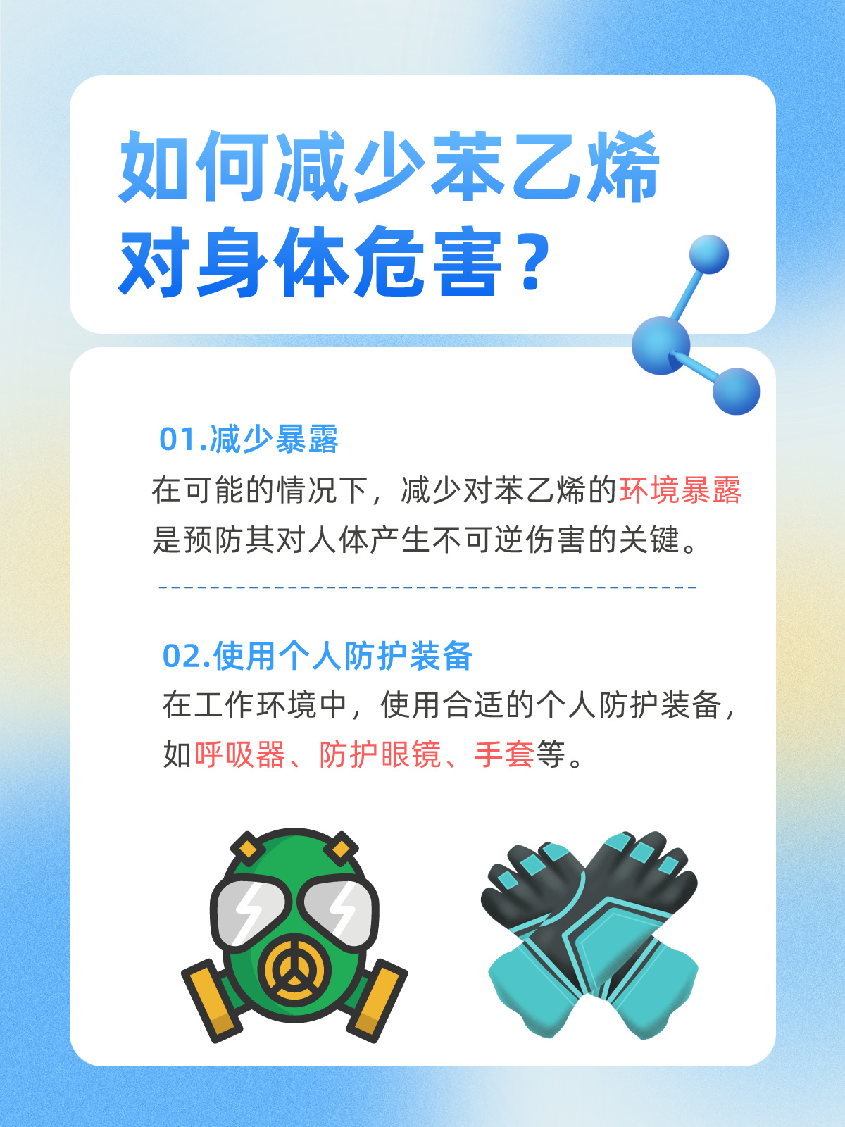 我看到他认真听着,便提出一些建议:“为了减少苯乙烯的危害,工作时应该使用适当的个人防护装备,比如防护口罩和手套。同时,确保工作区域有良好的通风,减少苯乙烯的积聚。”