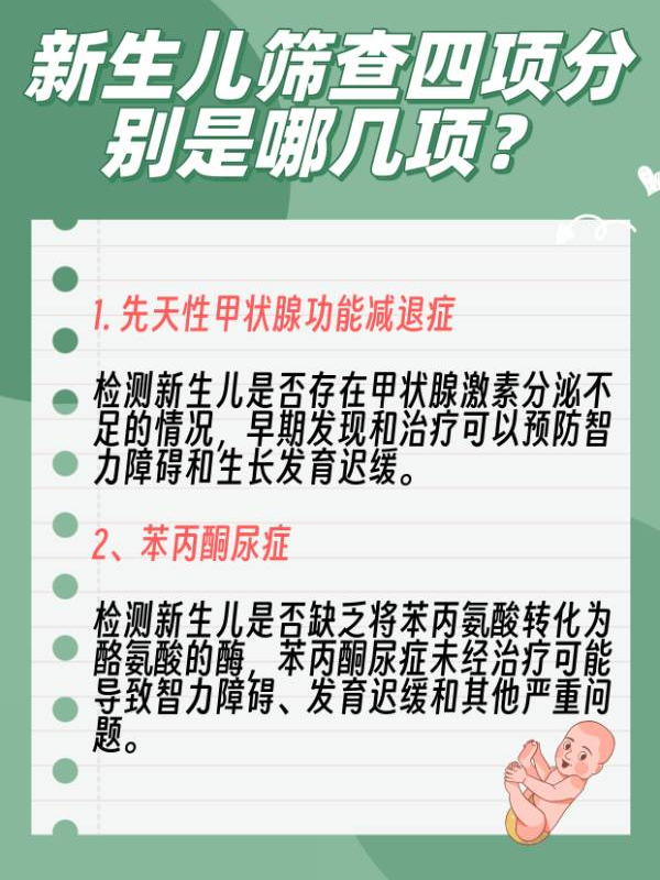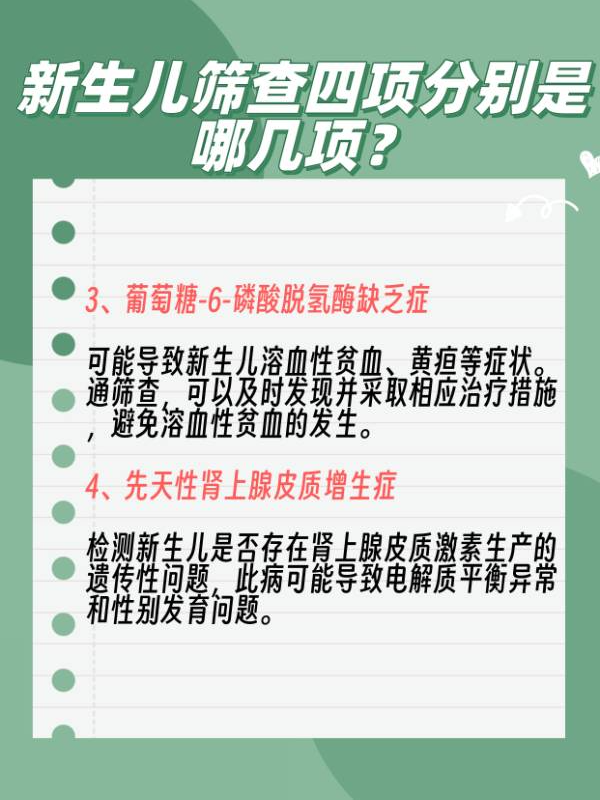 经过一番询问,我终于了解到新生儿筛查四项分别是什么:先天性甲状腺功能减退症、苯丙酮尿症、葡萄糖-6-磷酸脱氢酶缺乏症和先天性肾上腺皮质增生症,这些复杂的名词听起来既复杂又让人心慌,但医生的耐心解释让我慢慢明白了每一项筛查的重要性。