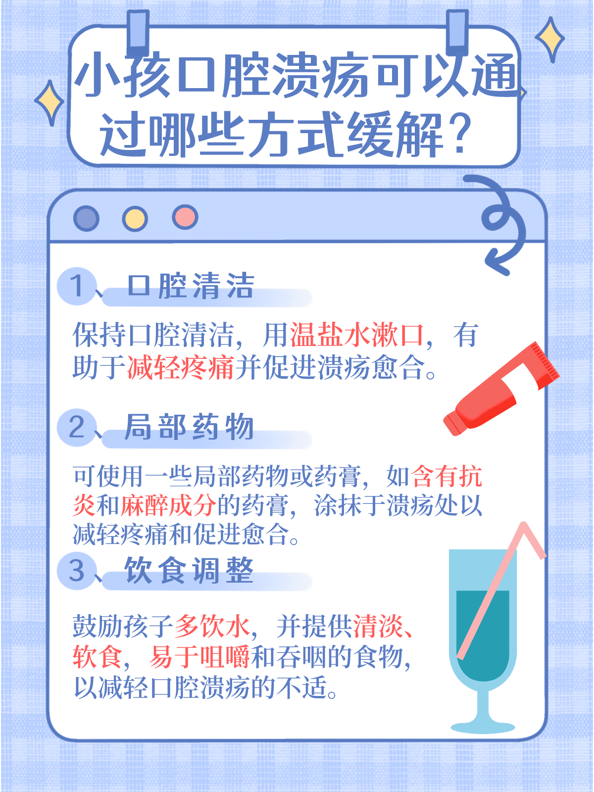 没有治儿童口腔溃疡的小妙招的说法,常见的治疗方法包括盐水漱口、局部用药、补充维生素、调整饮食、心理疏导等。 1、盐水漱口:盐水漱口是一种简单而有效的治疗口腔溃疡的方法,将适量的盐溶解在温水中,让儿童用盐水漱口,每天漱口2-3次。可以起到清洁