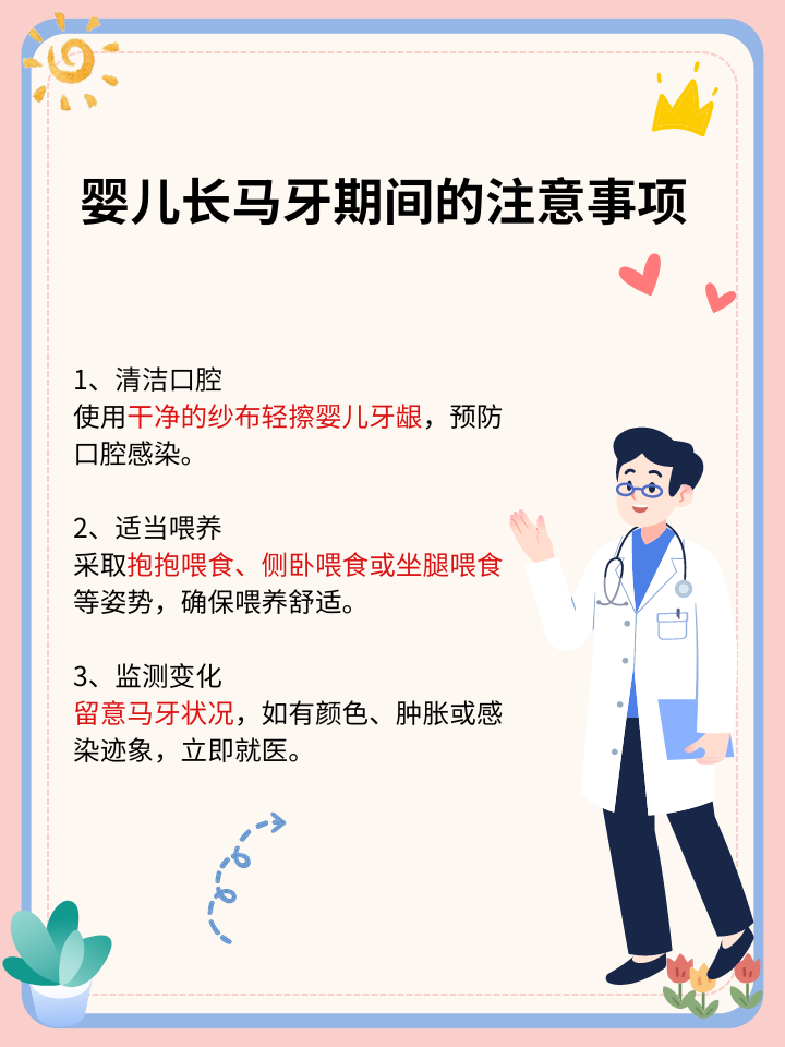 我还告诉这位妈妈一些婴儿长马牙期间的注意事项,包括保持清洁、观察变化、注意喂养姿势等。