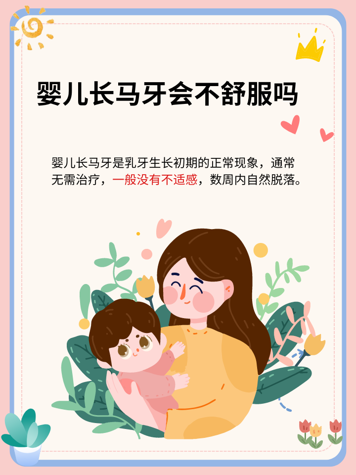 我向她解释道:婴儿长马牙,又称乳牙牙蕾,是乳牙生长的初步阶段。一般指婴儿牙龈边缘出现的黄白色小点,是牙板上的皮残留,不是真正的牙齿,通常会自行脱落。马牙一般没有不适感,数周后消退,也可存在较长时间,是刚刚出生的新生儿常见的生理现象。