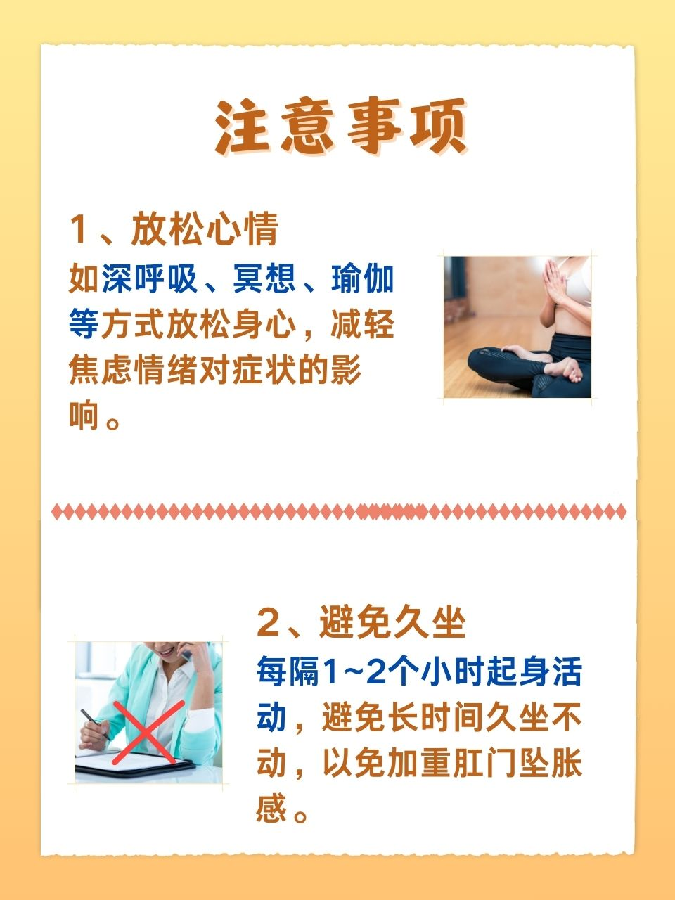 2、避免久坐:每隔1~2个小时起身活动,避免长时间久坐不动,以免加重肛门坠胀感。